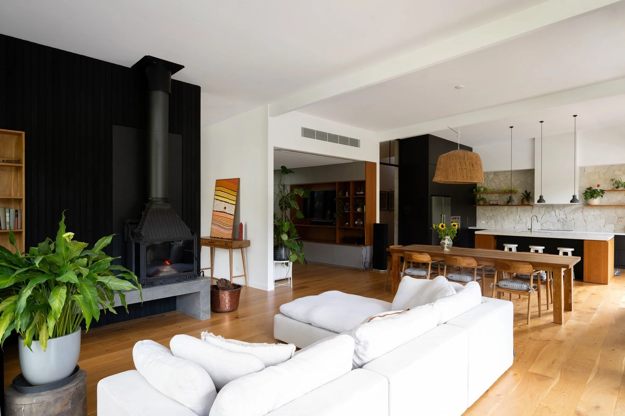 Floating teak staircase, polished concrete wall slabs and Chardonnay hardwood flooring throughout