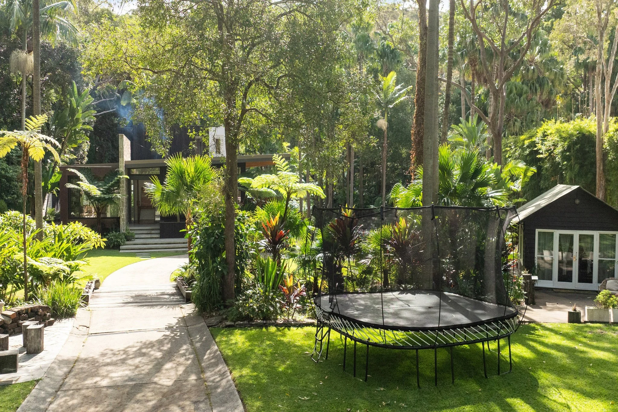 Living and dining spaces open through stacker and slider doors onto a sweeping deck overlooking the heated salt pool. A feature combustion fireplace, media room with roll-down projector screen and Wolf appliance kitchen with limestone splashback make everyday living feel quietly exceptional. Walkways wind through the property past secluded nooks, leading to the pool framed by towering palms, a standalone sauna and a self-contained studio.
